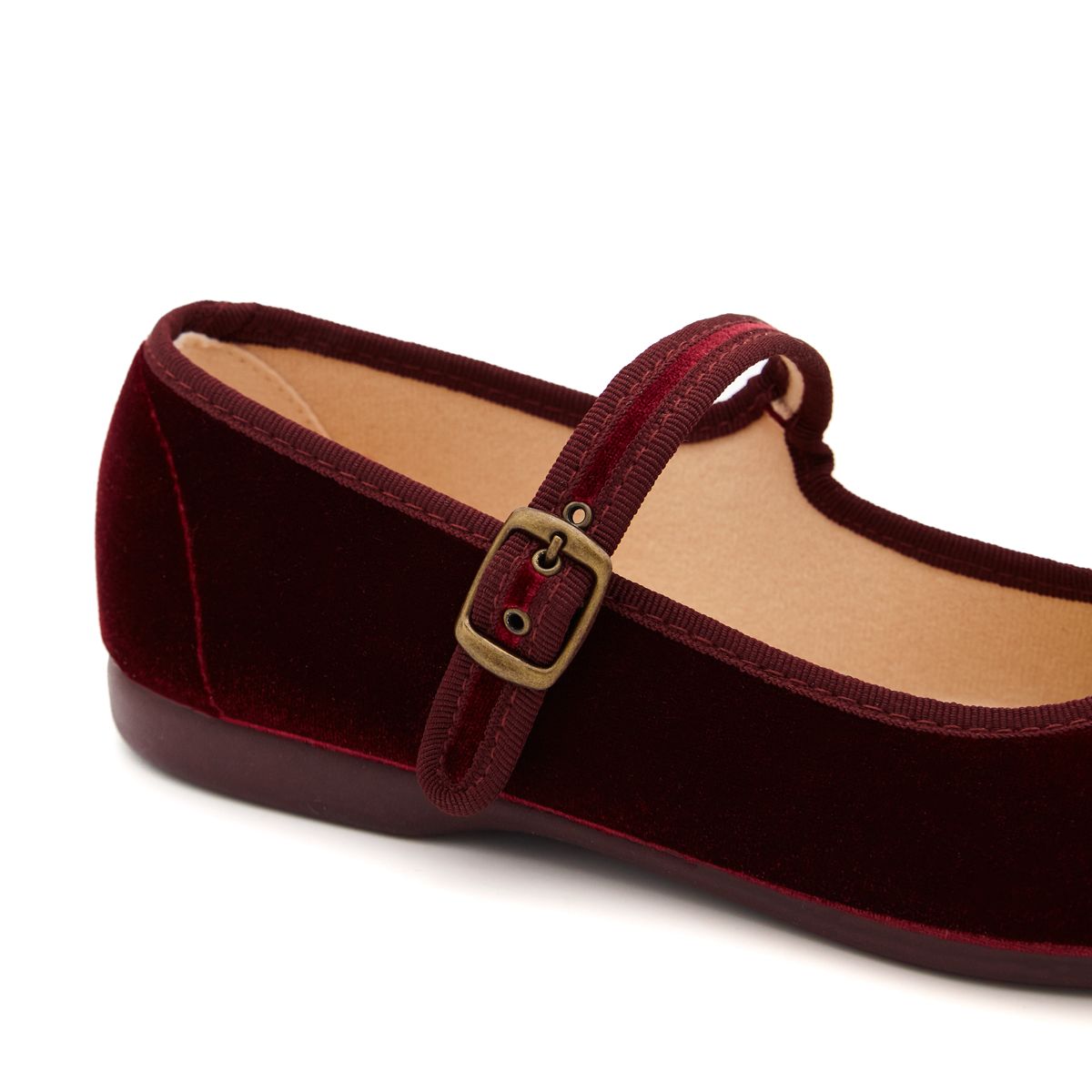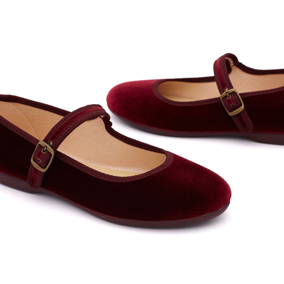 Las Merceditas de Terciopelo Burdeos para Mujer marca Pasitrote cuentan con una tira con cierre de hebilla lateral y la suela es de goma súper flexible en el mismo tono.
