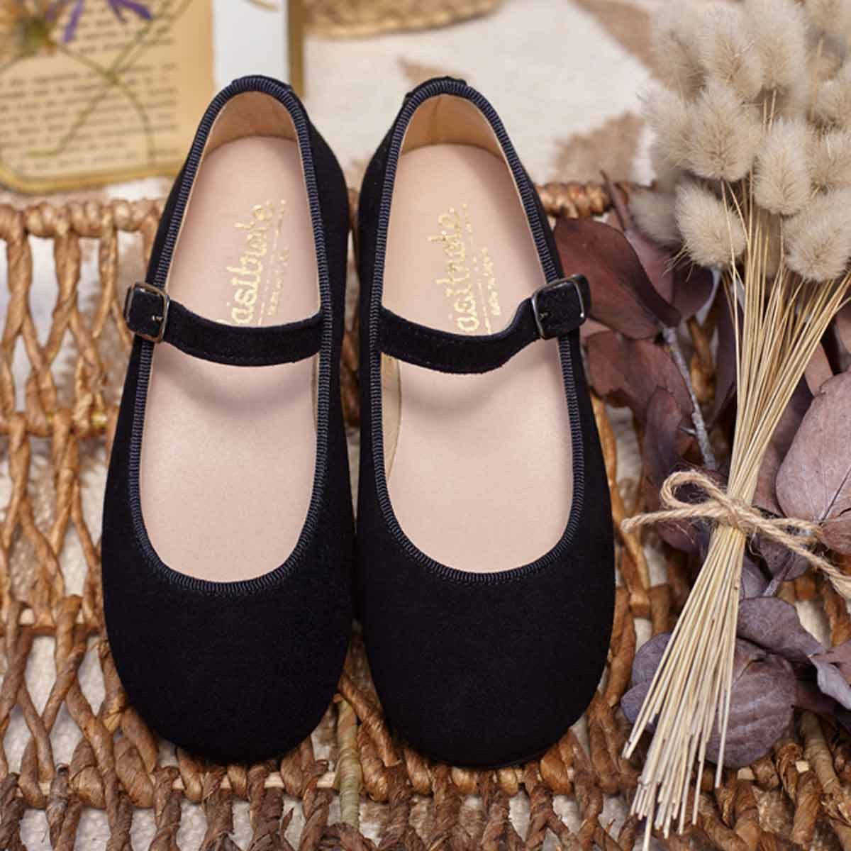 Merceditas Negras para Niña, elaboradas en Ante 100% natural, tan sencilla y versátil que conjunta perfectamente con todos los looks de otoño e invierno. El cierre de hebilla permite un ajuste perfecto. El interior está totalmente forrado en piel natural con acolchado interior en la plantilla. La suela de alta calidad es flexible y antideslizante.